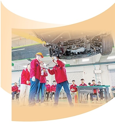 山東水利技師學院實訓中心,學生正進行整車維修和保養操作。