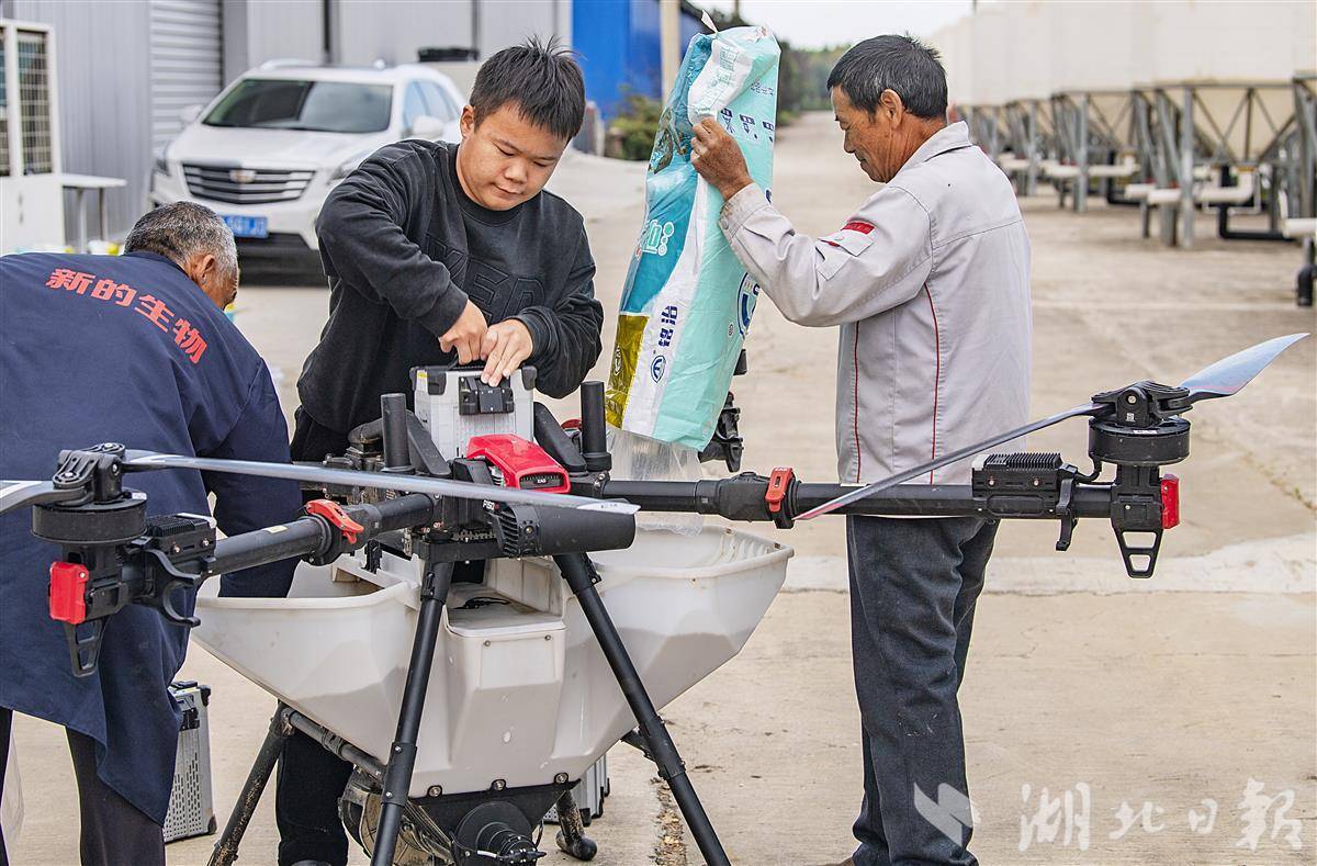 大學生徐順江給無人機換電池,工人給無人機裝飼料。