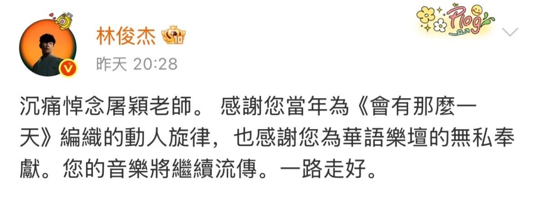 1日晚,歌手林俊杰在社交平臺發(fā)文,悼念屠穎,并感謝屠穎當(dāng)年為自己的《會有那么一天》編織動人旋律,“也感謝您為華語樂壇的無私奉獻。您的音樂將永久流傳。一路走好?!?