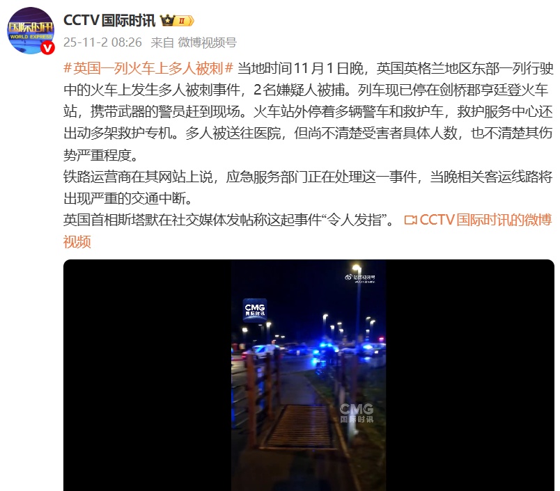 當地時間11月1日,英國一火車發生持刀行兇事件。