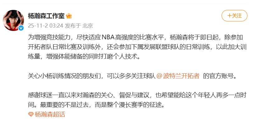 楊瀚森工作室發布聲明:為增強競技能力,盡快適應NBA高強度的比賽水平,楊瀚森將于即日起,除參加開拓者隊日常比賽及訓練外,還會參加下屬發展聯盟球隊的日常訓練,以此加大訓練量,增強體能儲備的同時打磨個人技術。