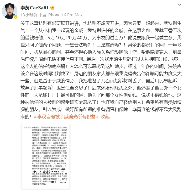 11月1日,“李茂自曝被親戚騙光所有積蓄”引發(fā)熱議。當晚,李茂發(fā)文稱,已向合肥市瑤海區(qū)法院提起民事訴訟,案件正處于審核階段。雖然親友建議以詐騙罪報案,但他考慮親情,只選擇民事追償,不再刑事追責。