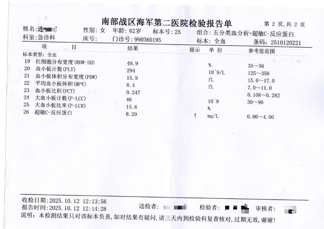 “經過化驗檢查,我孫女是凝血異常,醫生建議住院觀察治療;我化驗是血里有炎癥,超敏C-反應蛋白超標100%,也得觀察。”