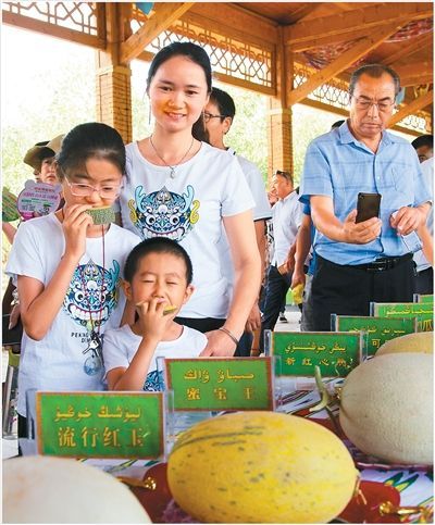 游客在哈密瓜節(jié)上品嘗哈密瓜。