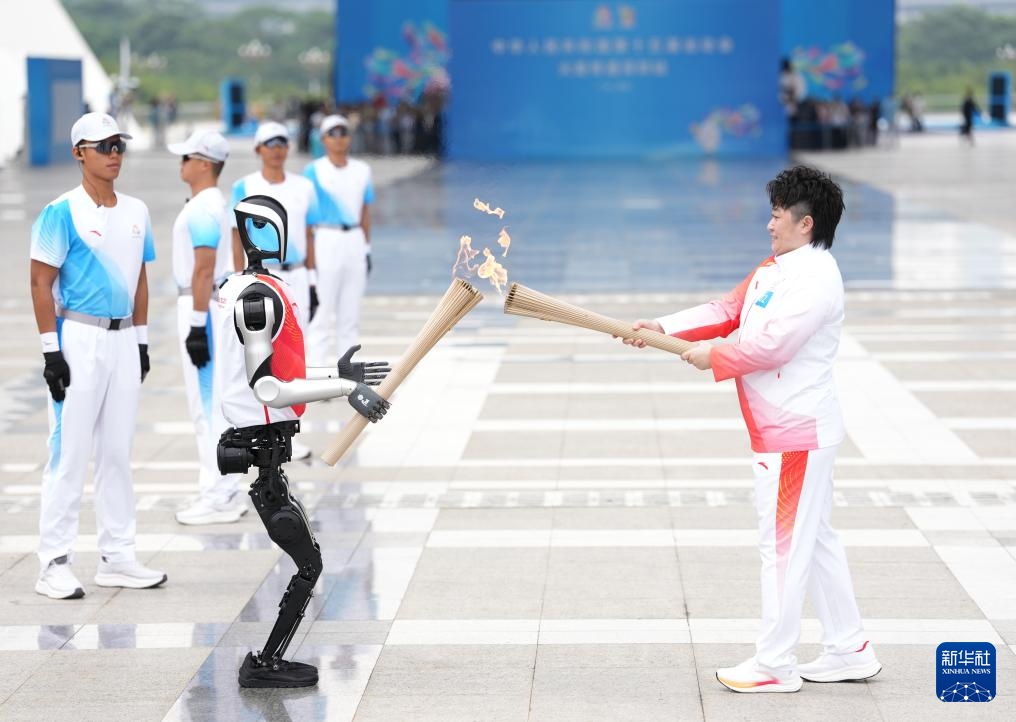 11月2日,火炬手人形機器人“夸父”與王裕寧(左)在火炬傳遞中。