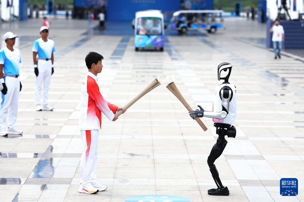 11月2日,于洋(右)與火炬手人形機器人“夸父”在火炬傳遞中。