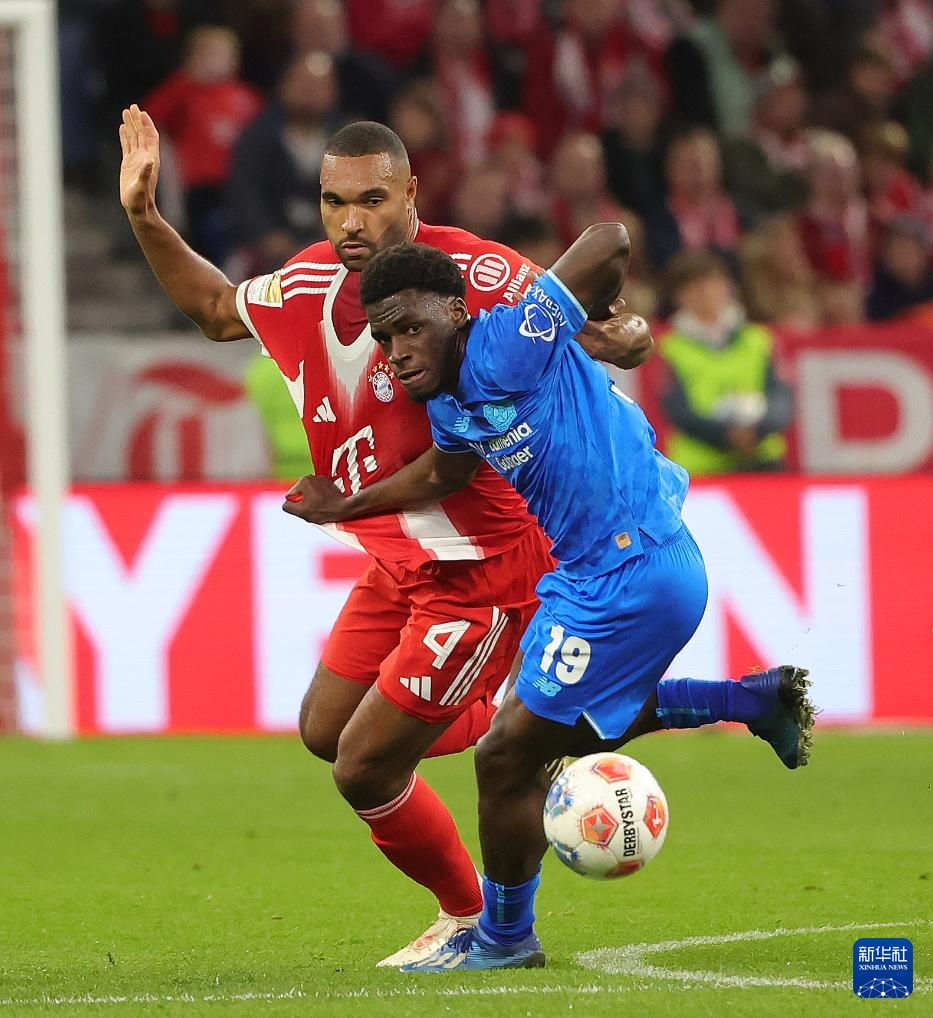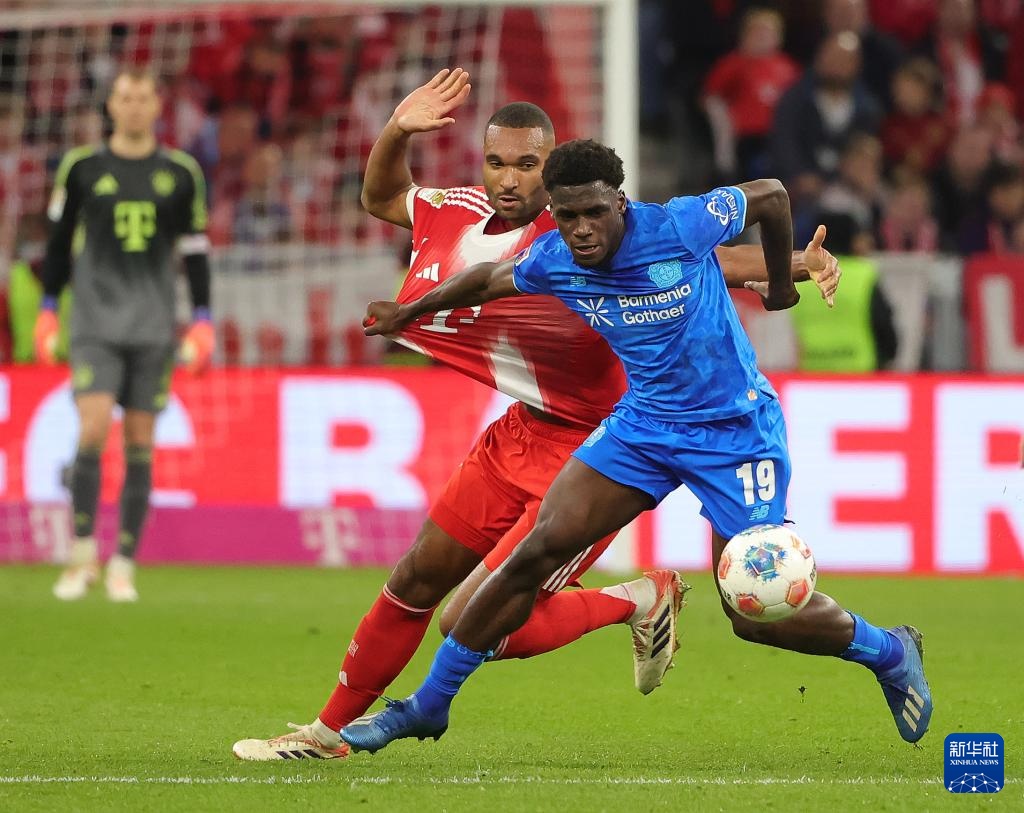 11月1日,拜仁慕尼黑隊球員塔赫(左)和勒沃庫森隊球員波庫在比賽中拼搶。