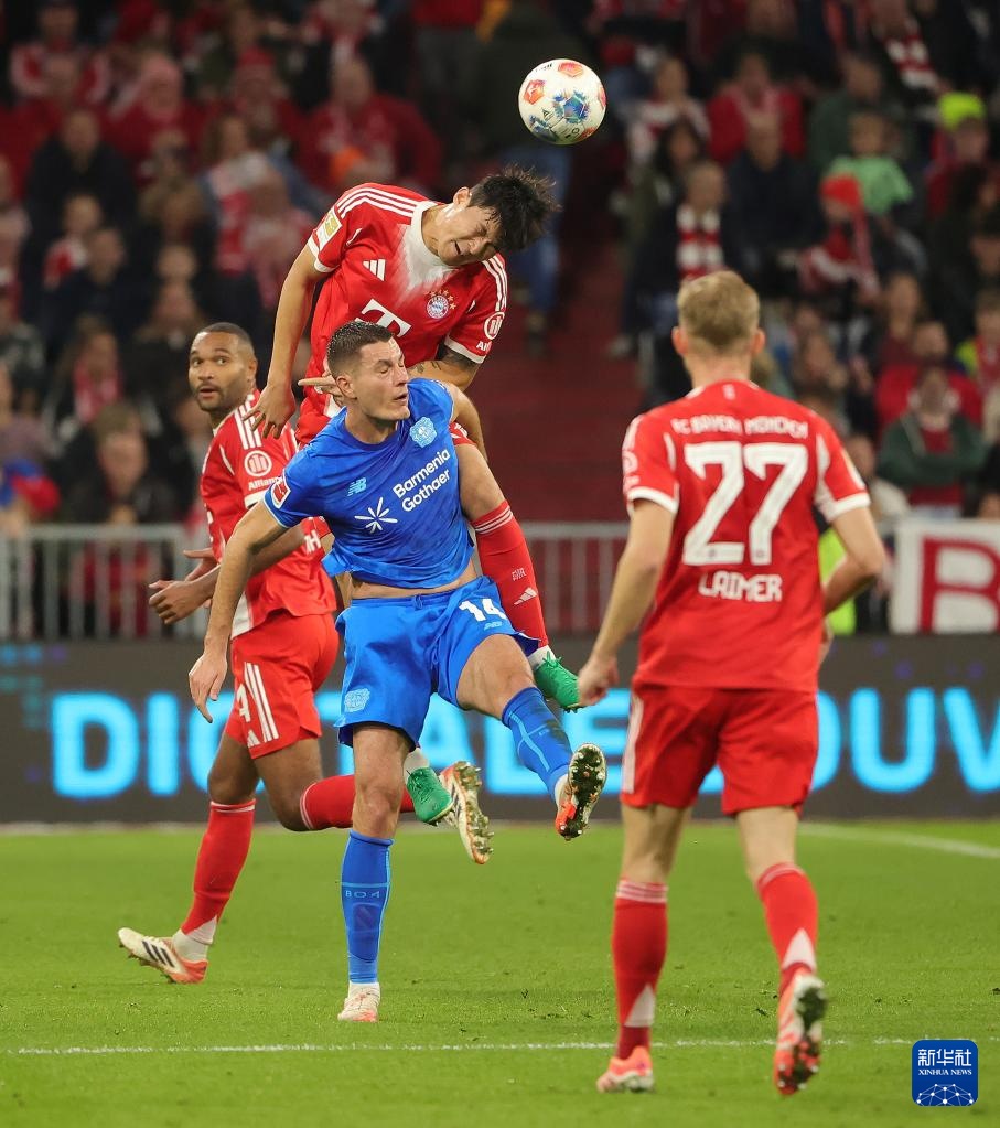 11月1日,拜仁慕尼黑隊球員金玟哉(上)和勒沃庫森隊球員希克(中下)在比賽中爭頂頭球。