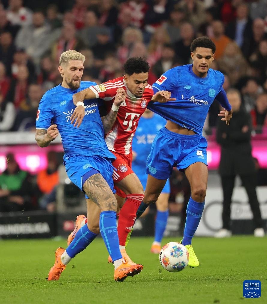 11月1日,拜仁慕尼黑隊球員迪亞茨(中)和勒沃庫森隊球員匡薩(右)、安德里希在比賽中拼搶。