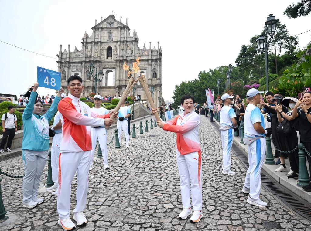 11月2日,火炬手陳虹(前右)、羅協銘在傳遞活動中交接圣火。當日,中華人民共和國第十五屆運動會火炬傳遞澳門站舉行。新華社發(張金加攝)