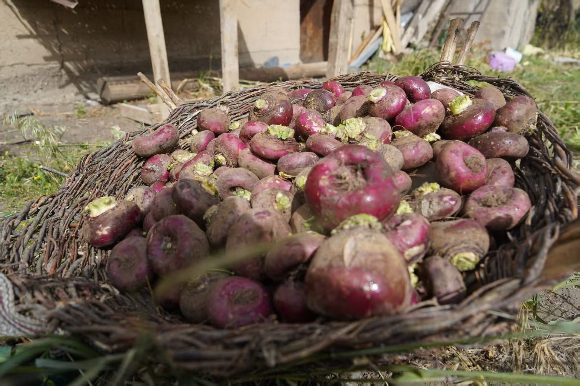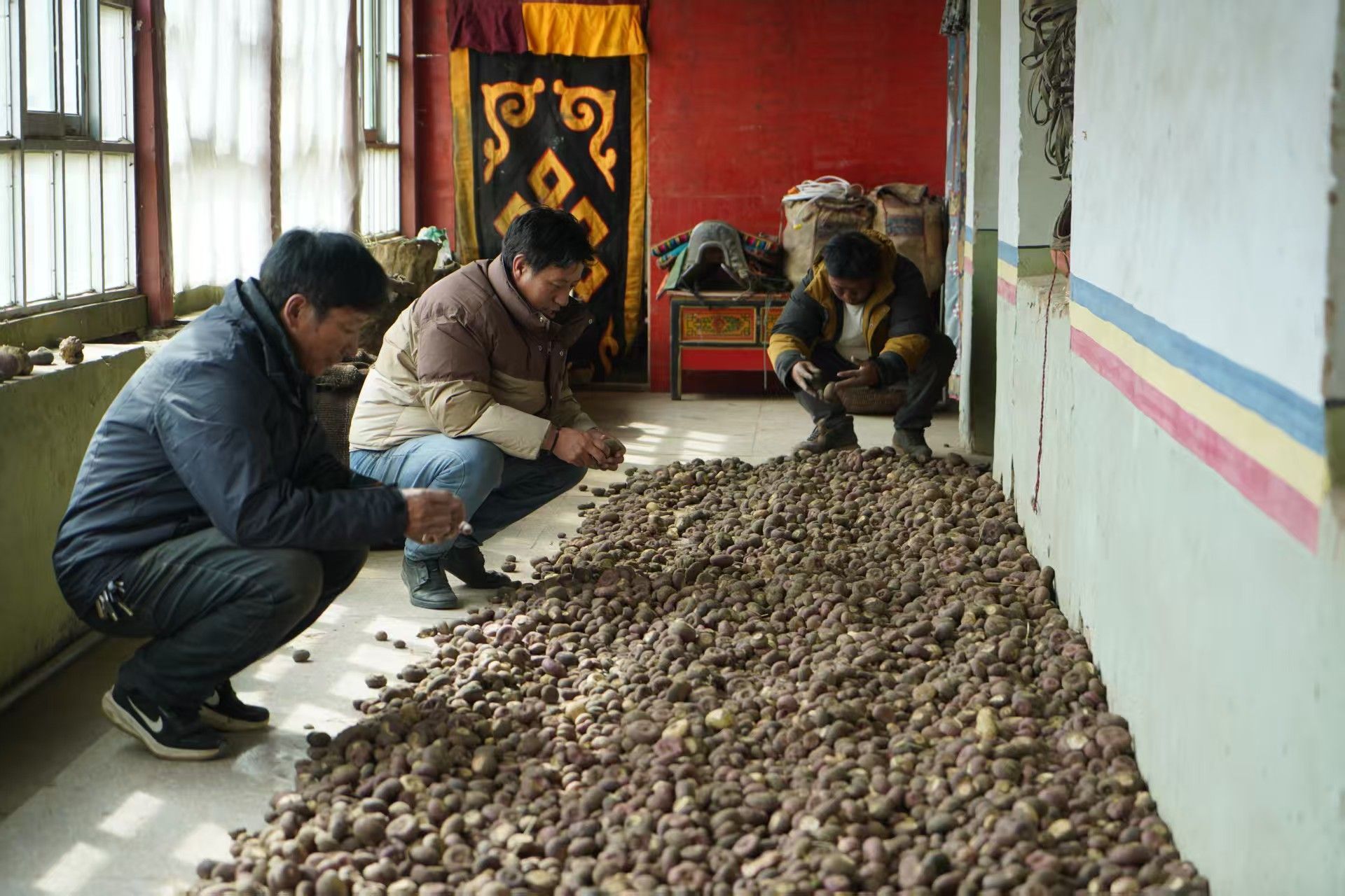 熾烈的高原陽光下,那曲市索縣若達鄉斯定卡村嘎松扎西的房子里,曬滿了紫紅的芫根,墻邊堆起一袋袋裝滿芫根的麻袋。