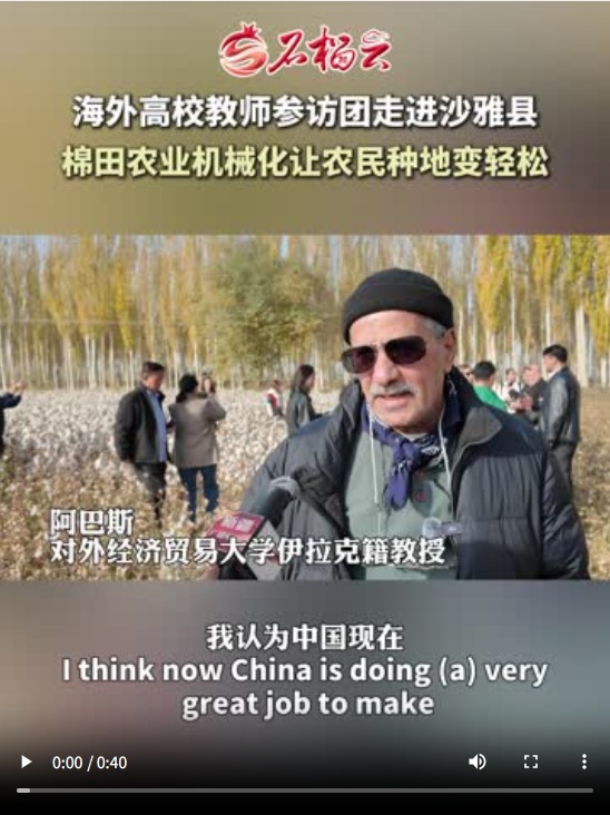 10月31日,“海外高校教師看新疆”活動(dòng)參訪團(tuán)開啟行程。參訪團(tuán)將走進(jìn)阿克蘇地區(qū)、烏魯木齊市,了解中國(guó)新疆的真實(shí)面貌。對(duì)外經(jīng)濟(jì)貿(mào)易大學(xué)伊拉克籍教授阿巴斯在參觀阿克蘇地區(qū)沙雅縣正在采收的棉田與相關(guān)企業(yè)之后表示,中國(guó)新疆的農(nóng)業(yè)現(xiàn)代化、智能化做得很好,讓農(nóng)民種地很輕松。