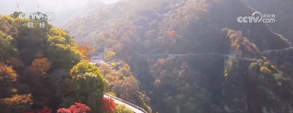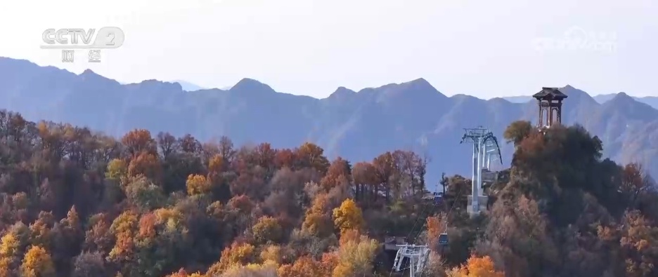 乘坐在平穩(wěn)運(yùn)行的吊廂里,最直觀的感受就是視野的震撼。大家看,窗外是沿途的秦嶺秋色,秦嶺巍峨而莊嚴(yán),而秋色像一位溫柔婉約的畫家,以金黃、火紅、深綠為墨,揮灑自如。山與色,一剛一柔、一靜一動,相互映襯,勾勒出一幅靜謐而深邃的秋日畫卷。