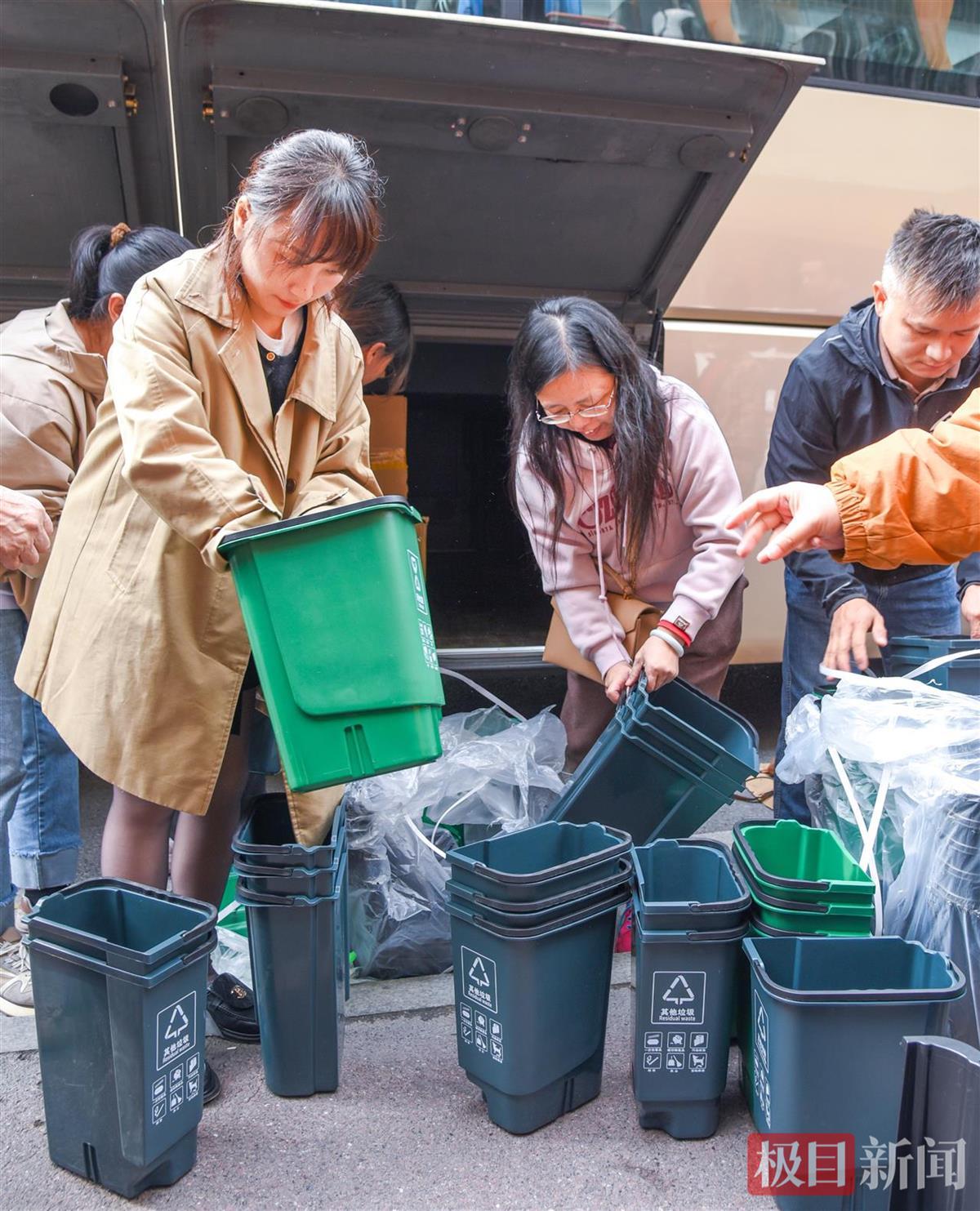 10月31日,活動(dòng)主辦方向荊州市沙市區(qū)解放街道十方庵社區(qū)南湖小區(qū)的居民代表發(fā)放“兩桶一袋”(極目新聞?dòng)浾?黃志剛 攝)