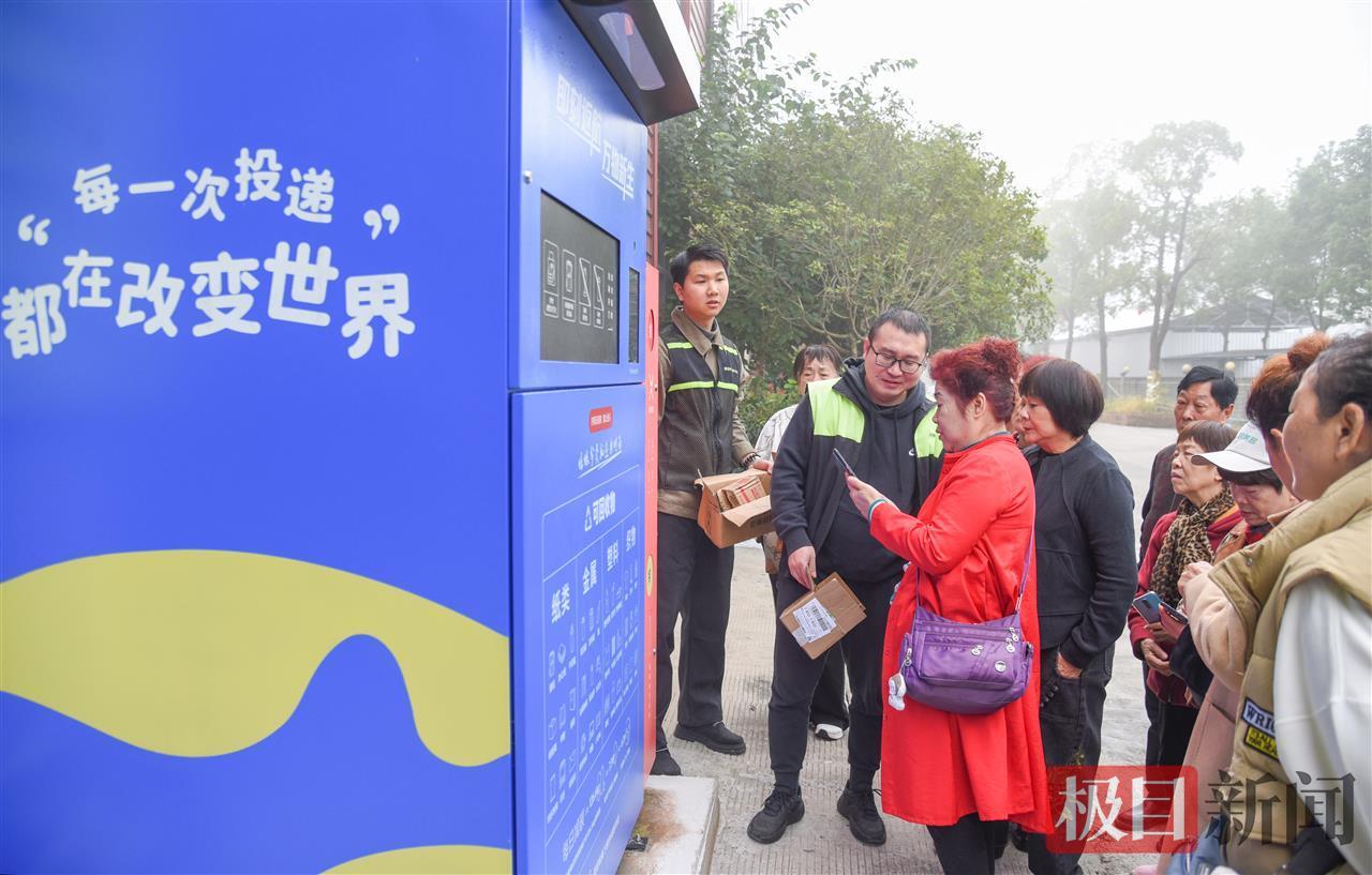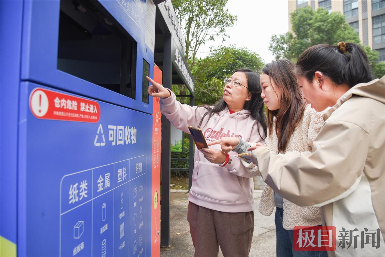 10月31日,荊州市沙市區(qū)解放街道十方庵社區(qū)工作人員在指導(dǎo)房投·十方庵小區(qū)的居民使用智能可回收物箱(極目新聞?dòng)浾?黃志剛 攝)