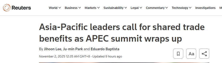 路透社的報道認為,在全球貿易秩序裂痕加深的背景下,亞太經合組織成員領導人在此次峰會閉幕之際通過的聯合聲明中,強調了貿易韌性和共享利益的必要性。