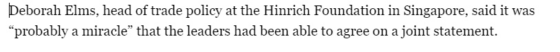 半島電視臺也關注了此次峰會,報道援引新加坡欣里奇基金會貿易政策負責人黛博拉?埃爾姆斯的話說,各成員領導人能夠就聯合聲明達成一致是“了不起的事情”。他說,鑒于亞太經合組織經濟體的不同立場,要將任何達成一致的措辭寫入文件都是一項“充滿挑戰的工作”。
