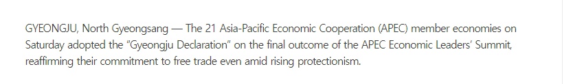 韓國《中央日報》報道稱,《慶州宣言》反映出此次APEC領導人峰會的最終成果,并重申了在保護主義抬頭的背景下,各成員領導人對自由貿易的承諾。