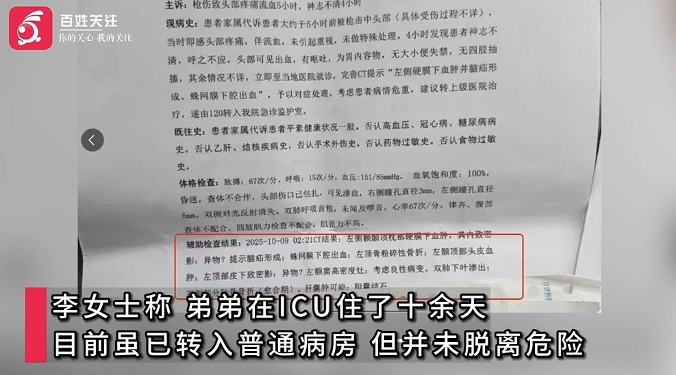 男子的姐姐李女士稱,“他那個(gè)子彈是鉛的,是那種鉛彈,那個(gè)槍打進(jìn)去的時(shí)候,頭骨一檔,就把那個(gè)子彈給打的碎掉了。現(xiàn)在那個(gè)頭骨里面還有一部分沒(méi)取出來(lái),人是抓到了,現(xiàn)在在拘留所,對(duì)方也不拿錢來(lái),他要我們拿那個(gè)諒解書他才肯出錢。”