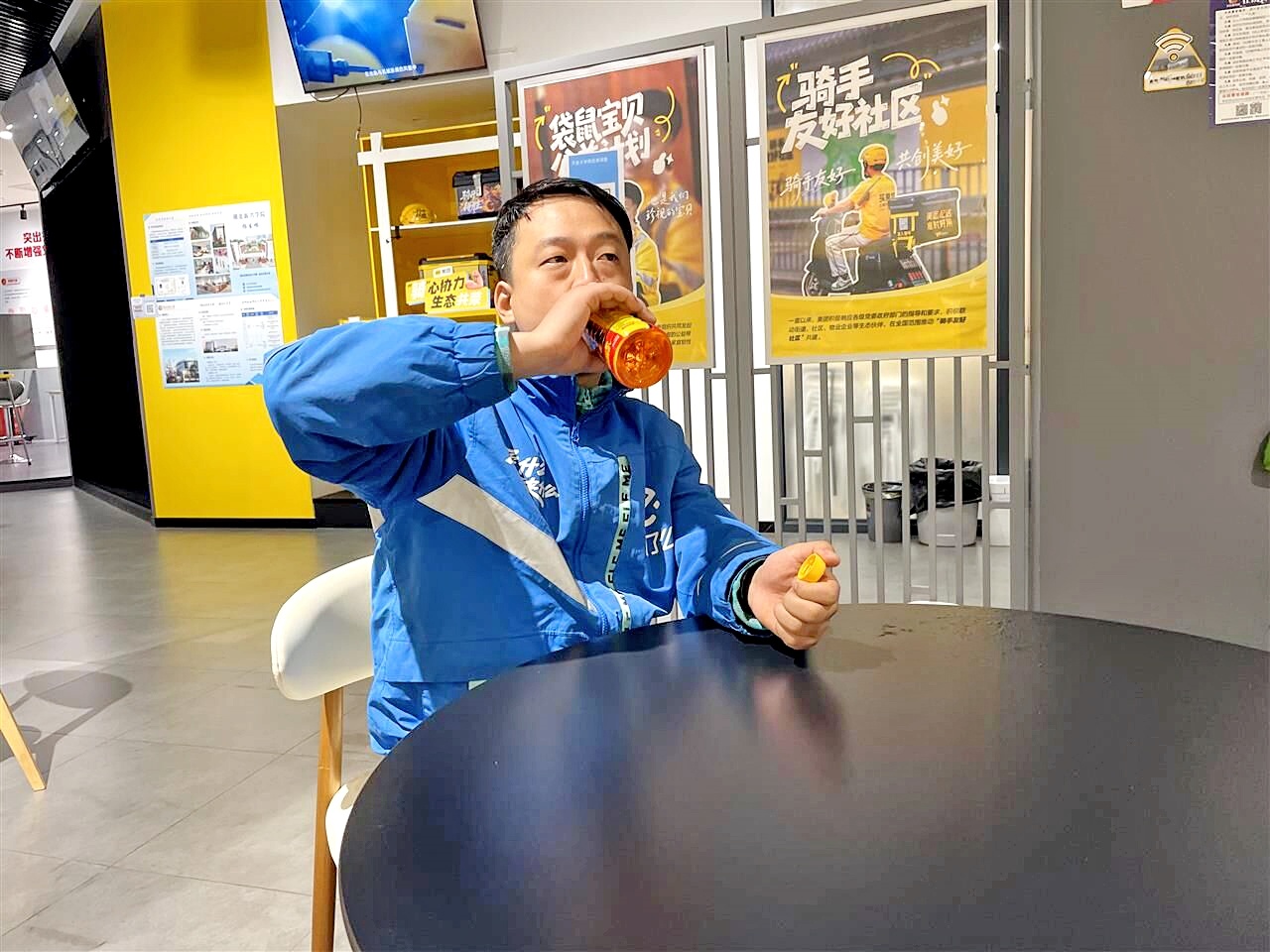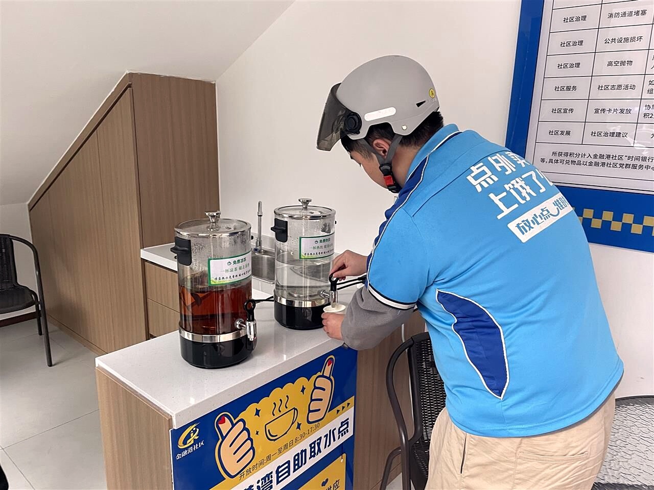 “夏天天熱的時候,一天下來,戶外工作者來這里取走200多瓶飲用水。能夠幫到他們,是社區(qū)為新就業(yè)群體盡的一份力量。”萬梅說。