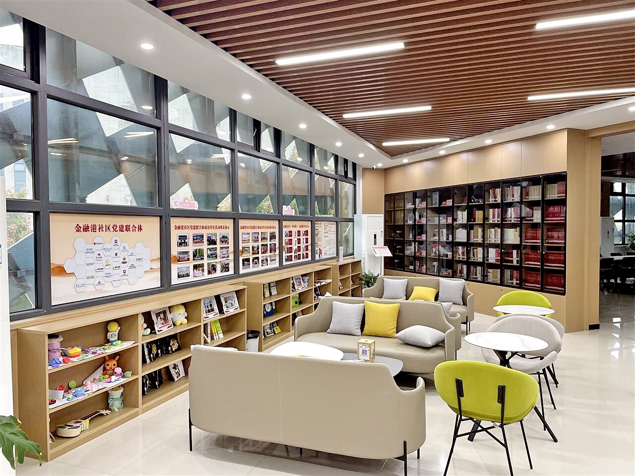 金融港社區(qū)黨員群眾服務(wù)中心二樓提供了空間很大的休息場所。萬梅介紹,戶外工作者可以免費借閱圖書,還可參加各項社區(qū)志愿活動獲取積分,用積分可兌換U盤、抽紙、洗手液等物品。