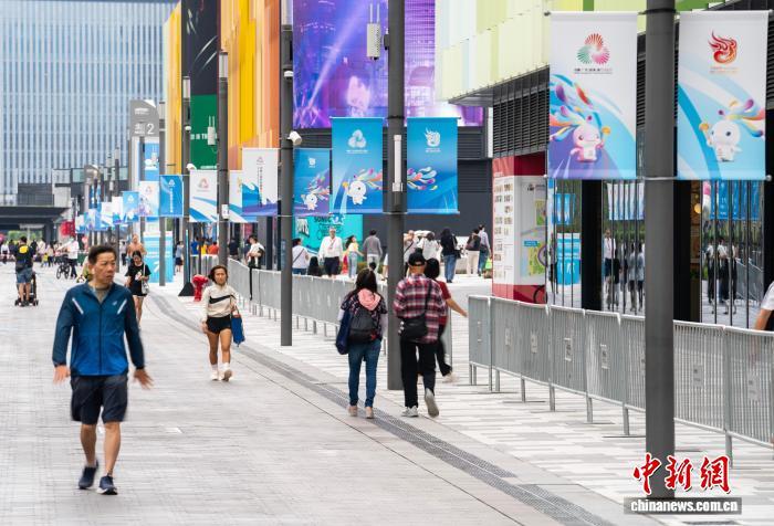 11月1日,香港新晉地標啟德體育園的體育大道沿途遍布第十五屆全國運動會(簡稱“十五運會”)裝飾宣傳元素,靜待本屆全運會于11月9日正式開幕。圖為體育大道沿線懸掛將于11月2日舉行的十五運會香港賽區火炬傳遞活動的裝飾宣傳物料。 中新社記者 侯宇 攝