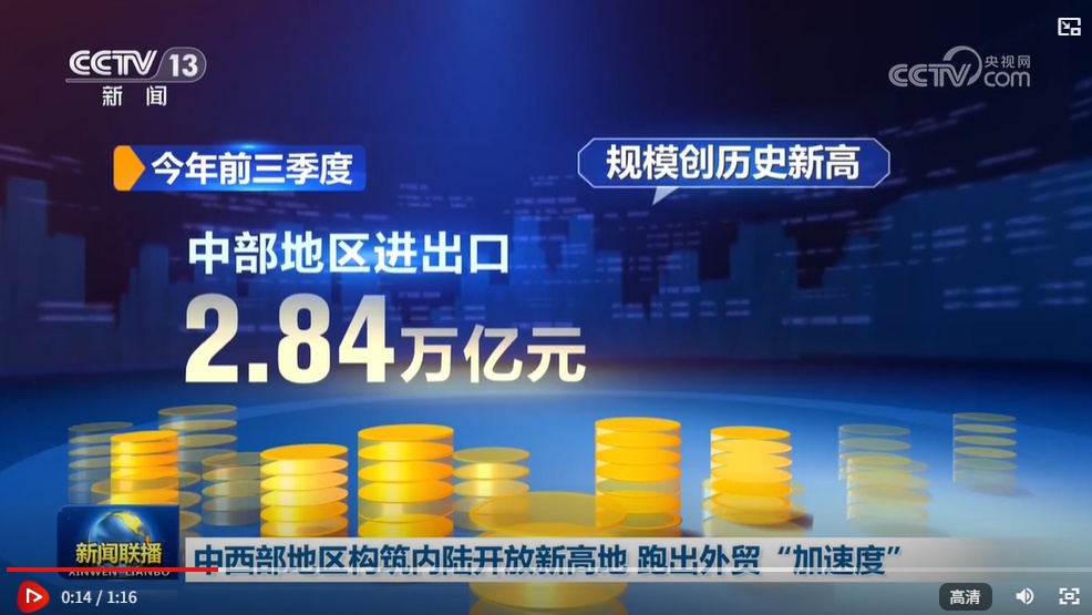 央視網消息(新聞聯播):數據顯示,今年前三季度,我國中西部地區外貿進出口再創新高,成為穩外貿、擴大開放的重要力量。