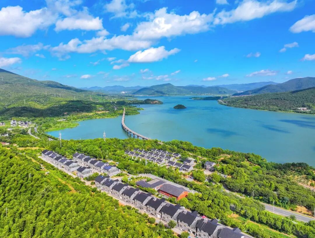浙江省湖州市長興縣小浦鎮合溪村,水庫與青山、村莊、道路相映成景,構成一幅風光旖旎、生態秀美的綠水青山壯麗畫卷。陳海偉 攝