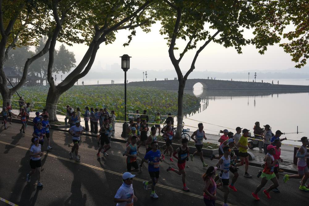 11月2日,參賽選手在比賽中經(jīng)過西湖景區(qū)斷橋附近。新華社記者 黃宗治 攝