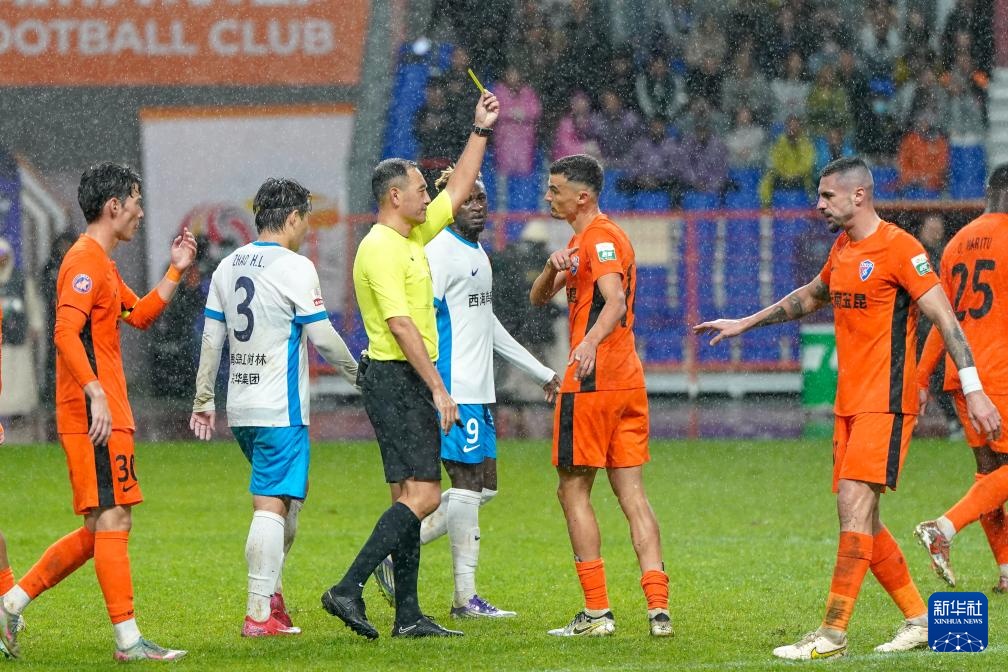 11月2日,主裁判劉威(左三)向云南玉昆隊(duì)球員內(nèi)內(nèi)(右三)出示黃牌。