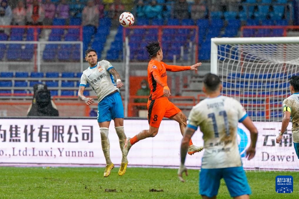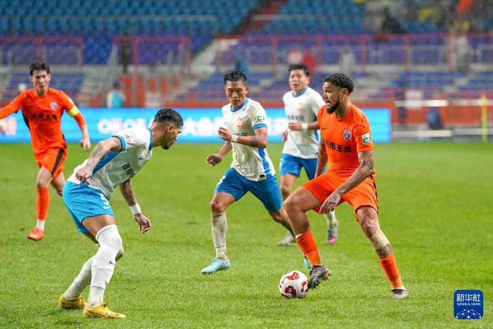 11月2日,云南玉昆隊(duì)球員孫學(xué)龍(前)與青島西海岸隊(duì)球員戴維森在比賽中爭(zhēng)搶。