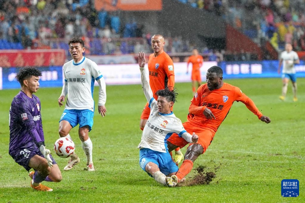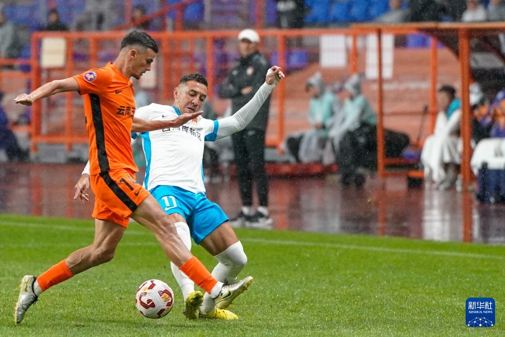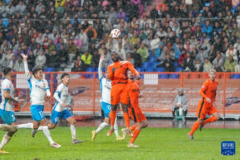 11月2日,青島西海岸隊(duì)球員里切利(上左)在比賽中爭(zhēng)頂。