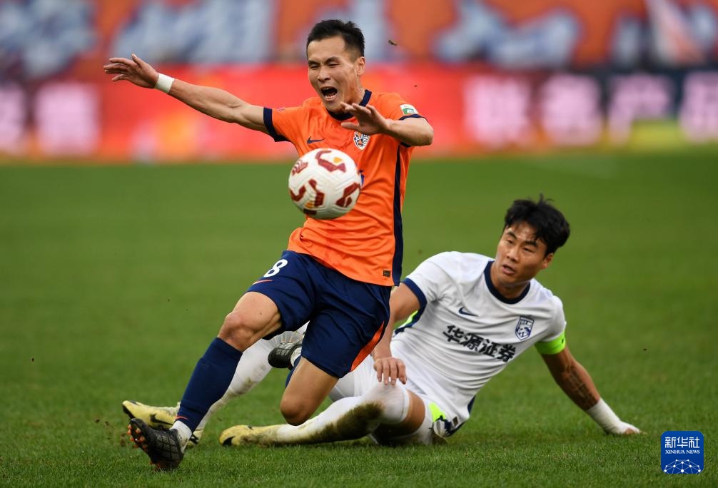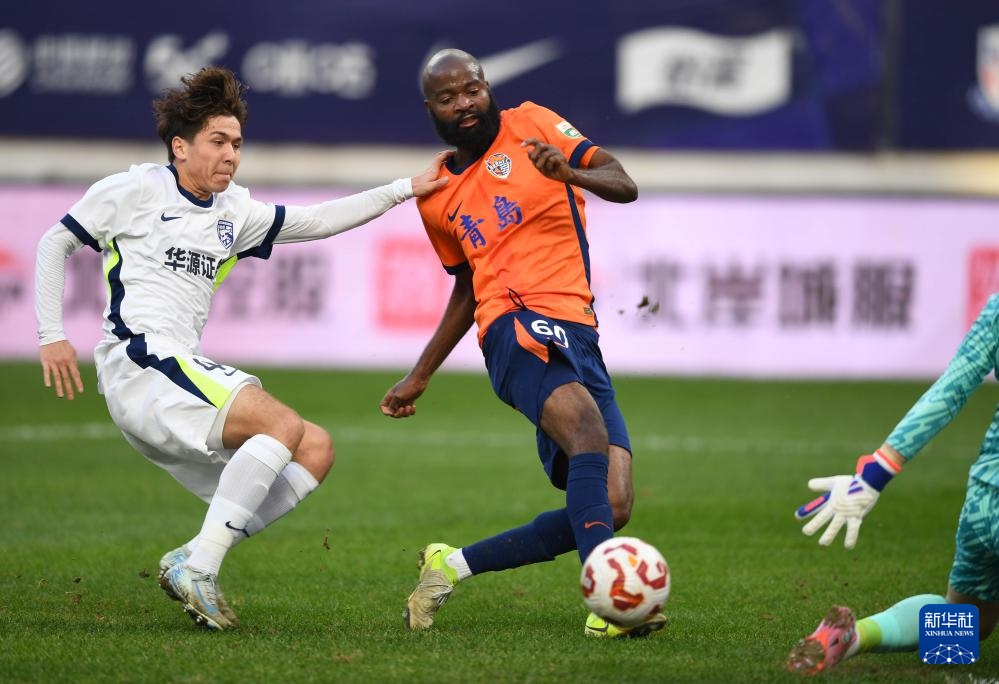 11月2日,青島海牛隊球員蘭克爾澤(右)在比賽中射門。