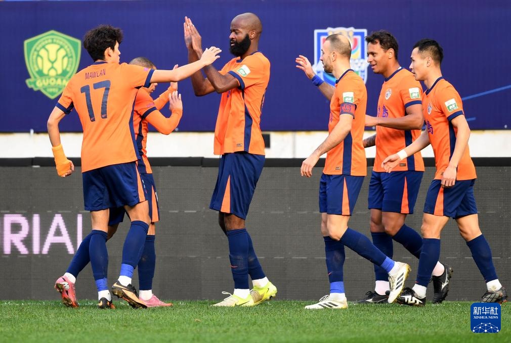 11月2日,青島海牛隊球員在比賽中慶祝進球。