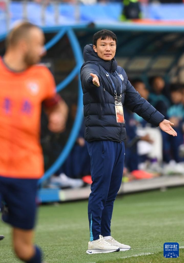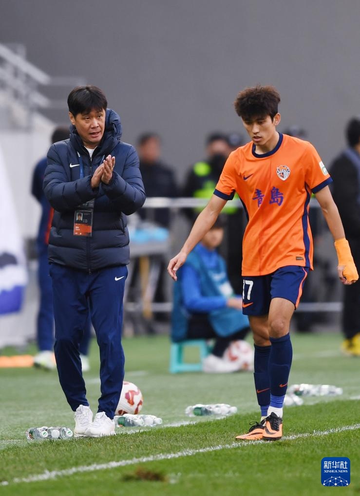 11月2日,青島海牛隊主教練李霄鵬(左)在場邊鼓勵球員。