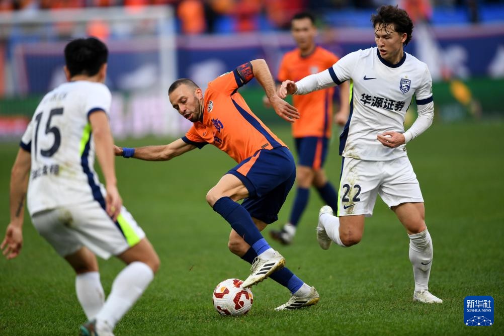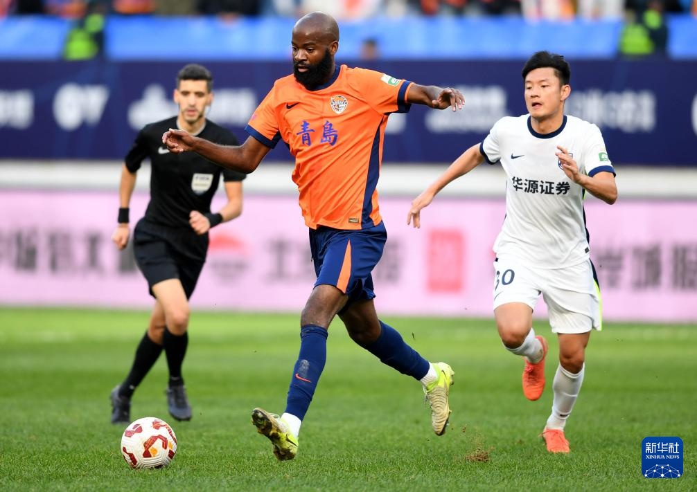 11月2日,青島海牛隊球員蘭克爾澤(中)在比賽中帶球突破。