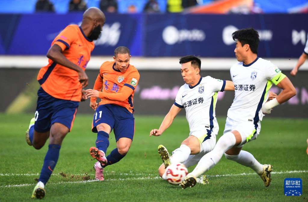 11月2日,青島海牛隊球員席爾瓦(左二)在比賽中射門。