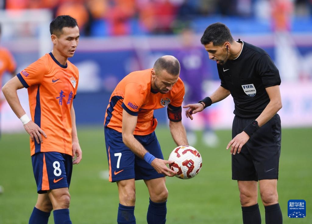 11月2日,主裁判伊斯梅爾?穆罕默德?薩米(右)在比賽中與青島海牛隊球員薩里奇(中)交流。