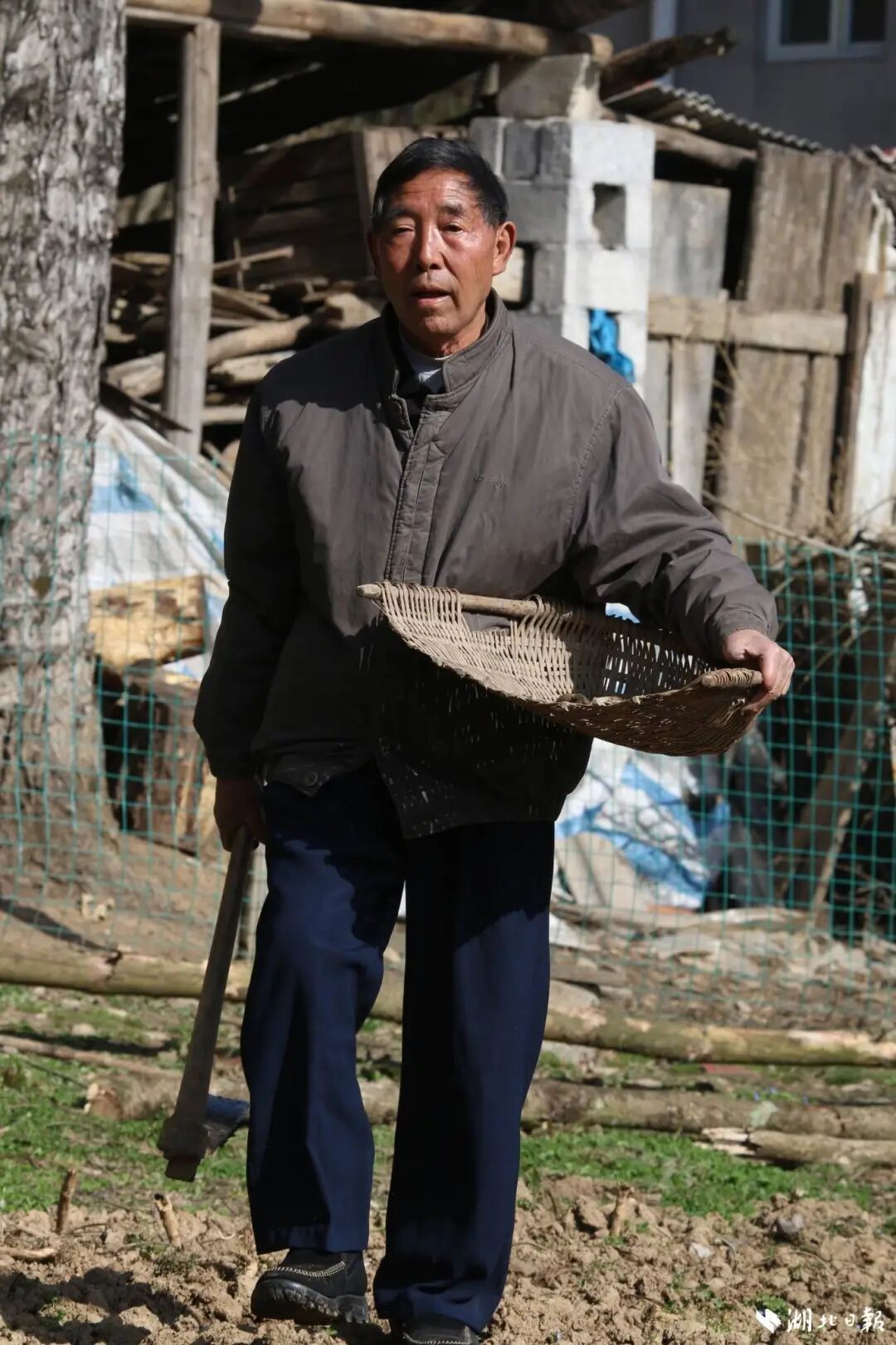 羅官章拿著農具忙農活。