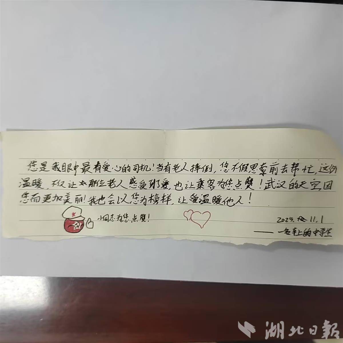 武漢司機(jī)路邊 “搭把手” 扶老人,中學(xué)生偷偷遞紙條:您超棒!