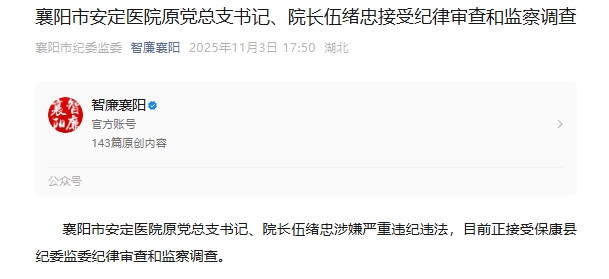 據襄陽市紀委監委消息,襄陽市安定醫院原黨總支書記、院長伍緒忠涉嫌嚴重違紀違法,目前正接受??悼h紀委監委紀律審查和監察調查。