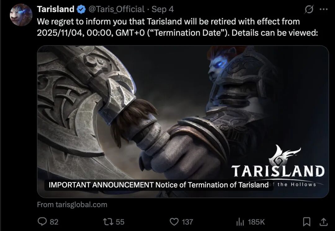 我們很遺憾地通知您,《塔瑞斯世界》將于2025年11月4日00:00(GMT+ 0)起停止服務(“終止日期”)。不同時區的計劃終止日期如下: