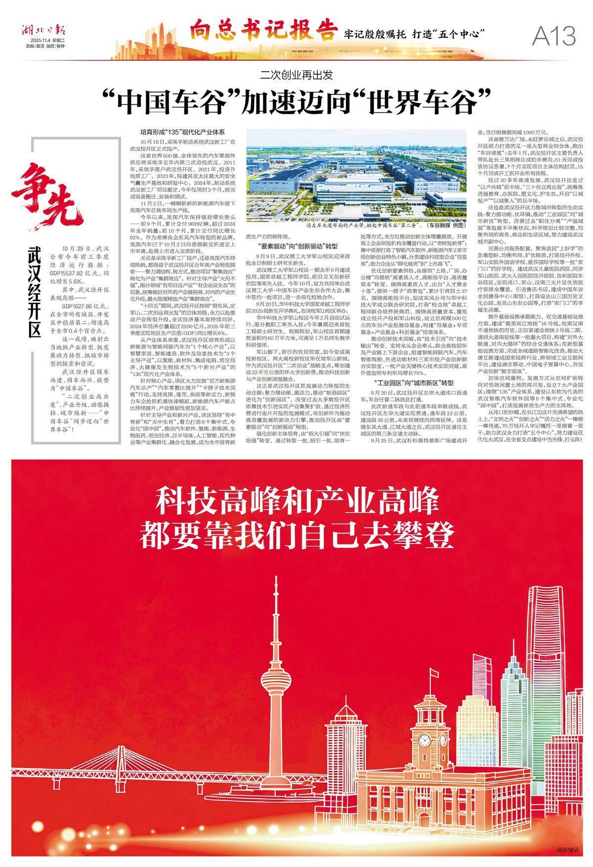一周年回訪之際,湖北日報推出大型特刊“向總書記報告”,武漢篇A13版聚焦武漢經開區抓產業轉型、抓發展動力轉型、抓城市轉型的探索和嘗試。以下為全文——