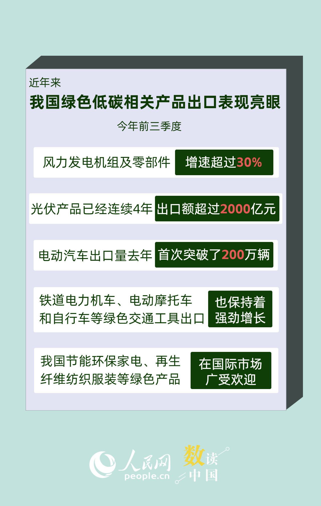 今年前三季度,風力發電機組及零部件增速超過30%;光伏產品已經連續4年出口額超過2000億元;電動汽車出口量去年首次突破了200萬輛……近年來,中國外貿企業積極順應貿易綠色化趨勢,將綠色低碳理念轉化為優質產品,豐富了全球供給。一組數據,帶你看中國外貿“向綠色”發展步伐加快。
