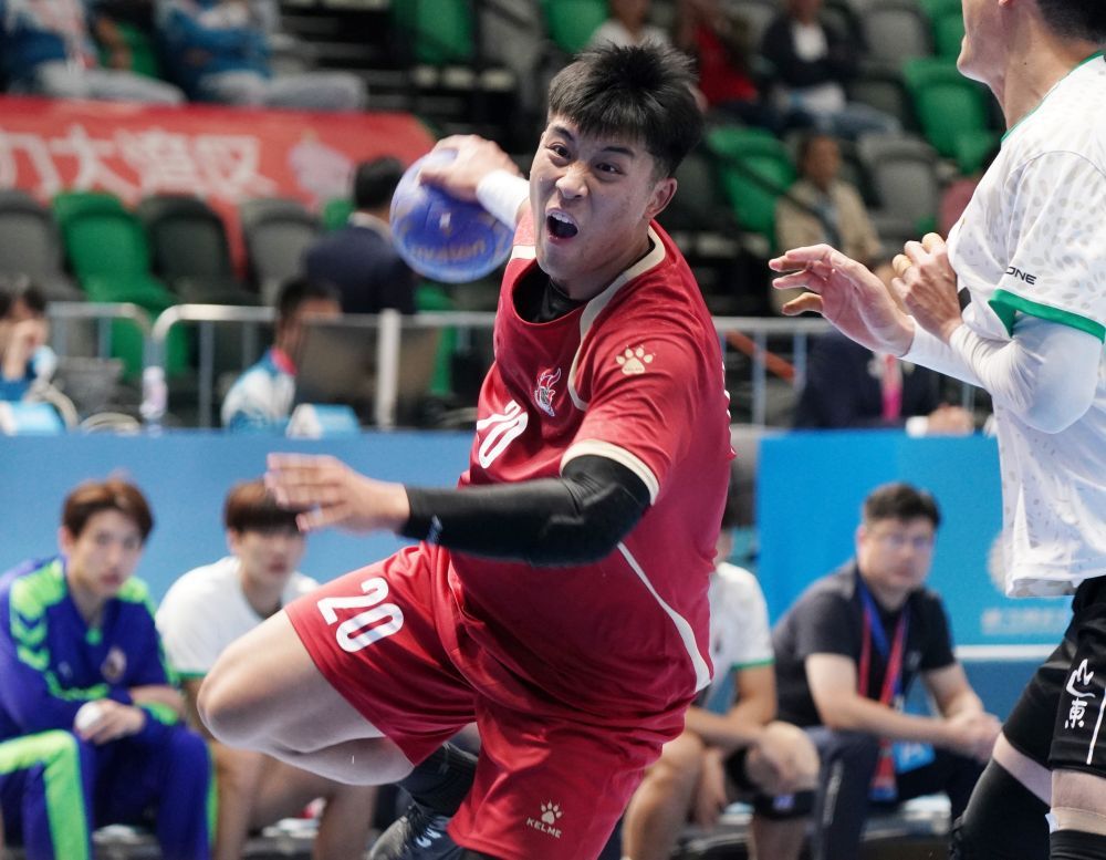 11月3日,山西隊球員劉文東(左)在比賽中進攻。當日,在香港啟德體藝館舉行的第十五屆全國運動會男子手球預賽B組比賽中,山西隊33比32戰勝山東隊。新華社發 (王申攝)
