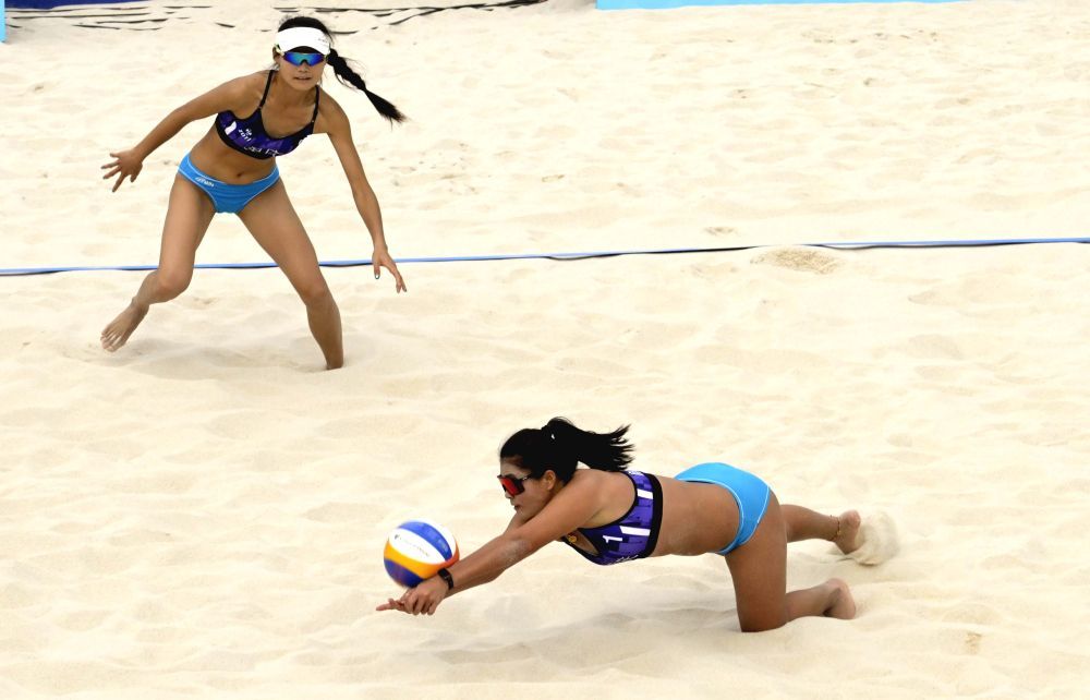11月3日,顏云肖(前)/高月云在比賽中。當日,在香港舉行的第十五屆全國運會沙灘排球女子小組賽D組比賽中,浙江隊組合王凡/姚欣2比1戰勝重慶隊組合顏云肖/高月云。新華社發(盧炳輝攝)