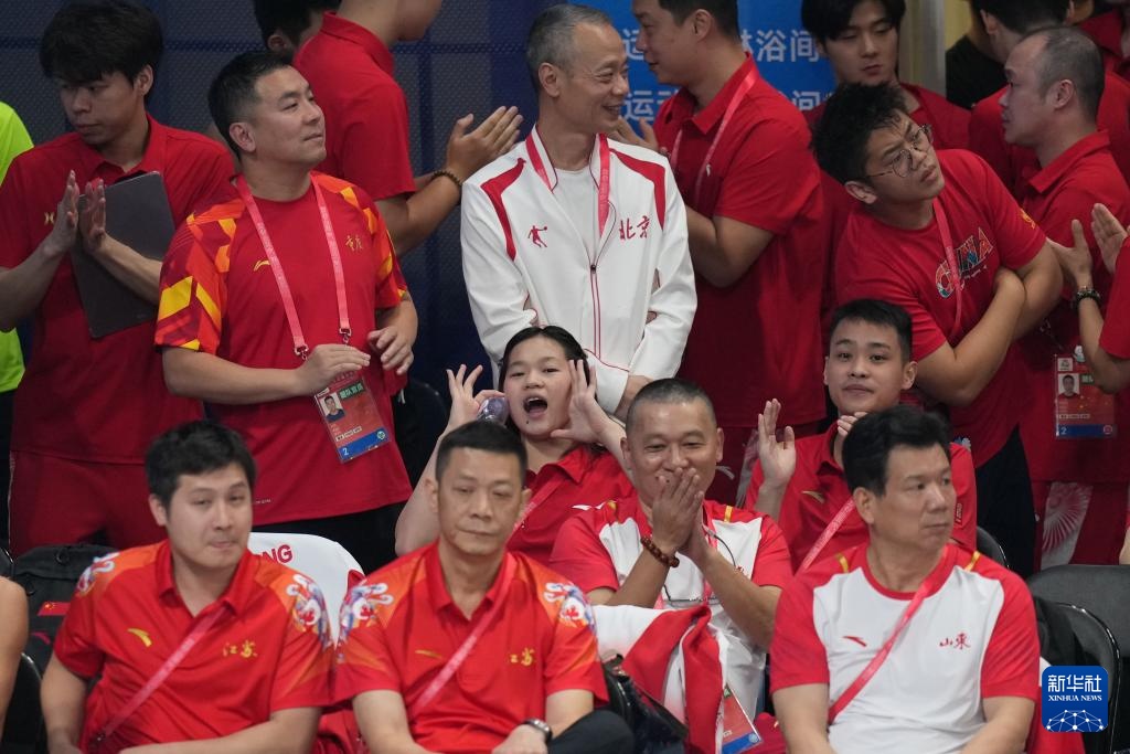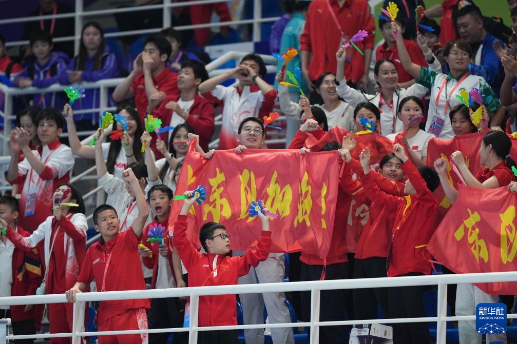11月3日,全紅嬋(中)觀看男子雙人10米跳臺比賽時為隊友加油。
