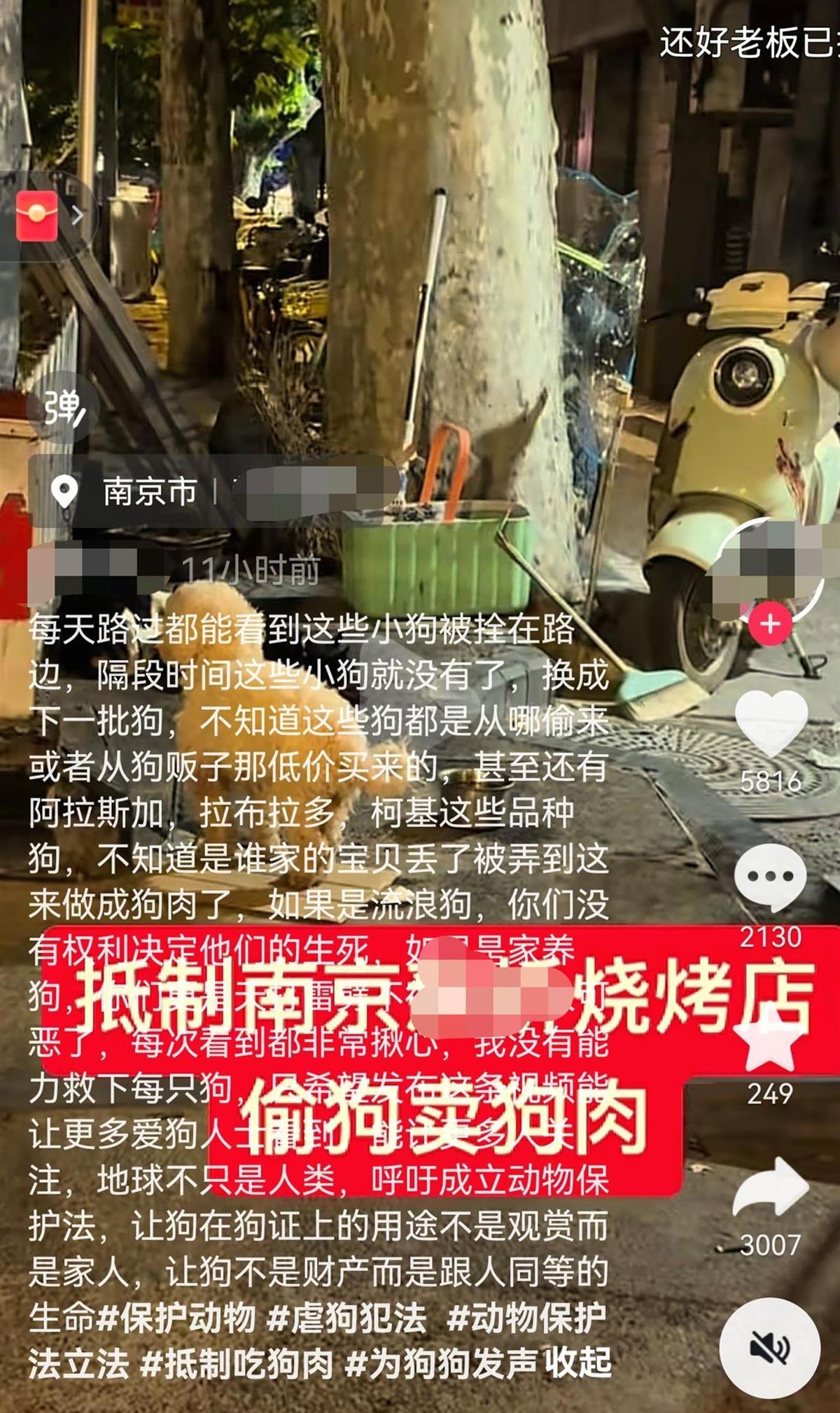 3日晚,南京一位網(wǎng)友發(fā)布視頻時配文寫道:“每天路過都能看到這些小狗被拴在路邊,隔段時間這些小狗就沒有了,換成下一批狗,不知道這些狗是從哪偷來或者從狗販子低價買來的,甚至還有阿拉斯加、拉布拉多、柯基這些品種狗,不知道是誰家的寶貝丟了被弄到這來做成狗肉了……我沒有能力救下每只狗,只希望發(fā)布這條視頻能讓更多愛狗人士看到……”其發(fā)布的視頻中,僅是一家燒烤店前有兩只寵物狗,其中一只窩在地上。“抵制南京某燒烤店偷狗賣狗肉。”該網(wǎng)友還在視頻中標(biāo)注了這幾個紅色大字,并將燒烤店在第三方平臺的具體信息截圖附在視頻中。