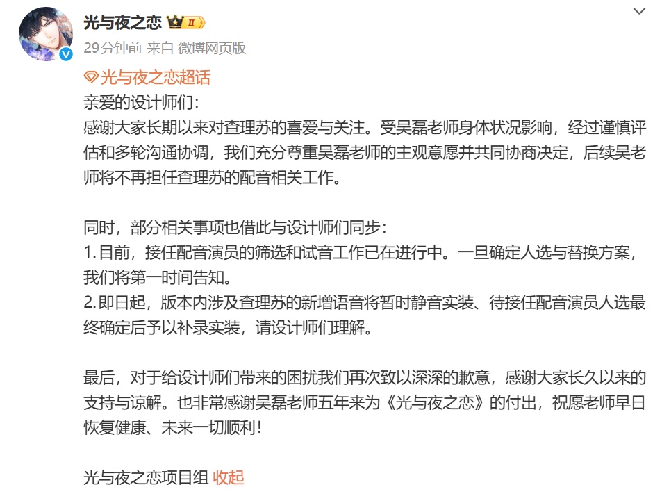 11月4日,配音演員吳磊@食不食毛毛發(fā)文:因受健康狀況影響,難以繼續(xù)用最佳狀態(tài)為查理蘇進行配音,經(jīng)過慎重考慮,以及與《光與夜之戀》項目組進行協(xié)商,將從即日起告別《光與夜之戀》的配音工作。