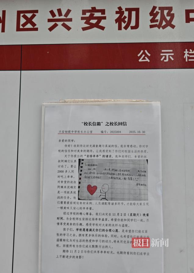 興安中學(xué)校長辦公室回復(fù)該學(xué)生,校長同學(xué)校老師、食堂工作人員商討,要讓學(xué)校2000多人一同吃上串串是一項(xiàng)極具挑戰(zhàn)性的任務(wù),需要提前規(guī)劃食材采購、人員調(diào)配等,經(jīng)過學(xué)校精心籌備,決定于11月2日晚餐,為全校師生安排串串盛宴。“孩子們,學(xué)校愿意滿足你們的合理心愿,希望你們能在緊張學(xué)習(xí)之余,擁有更多快樂體驗(yàn)?!?/p>